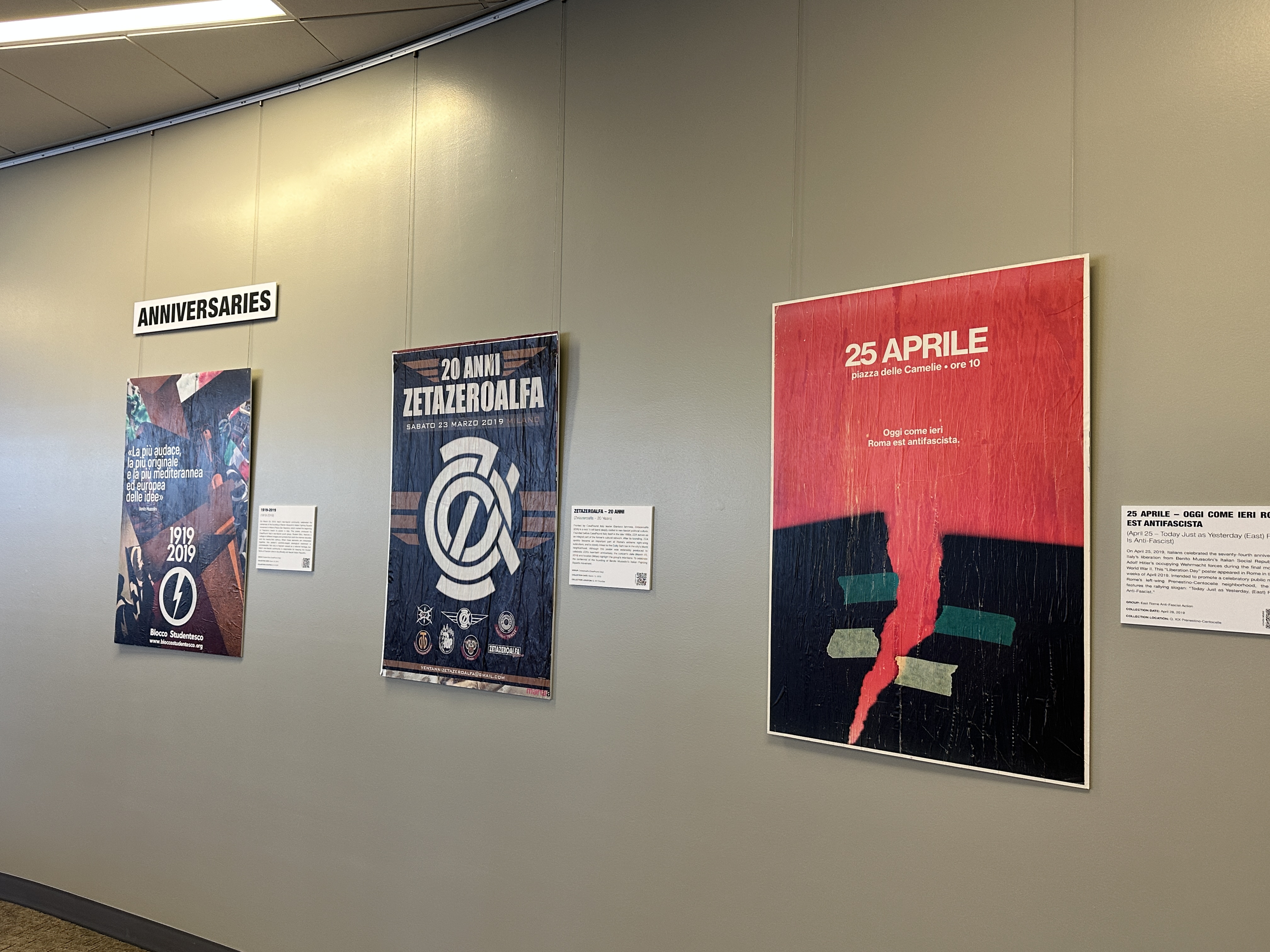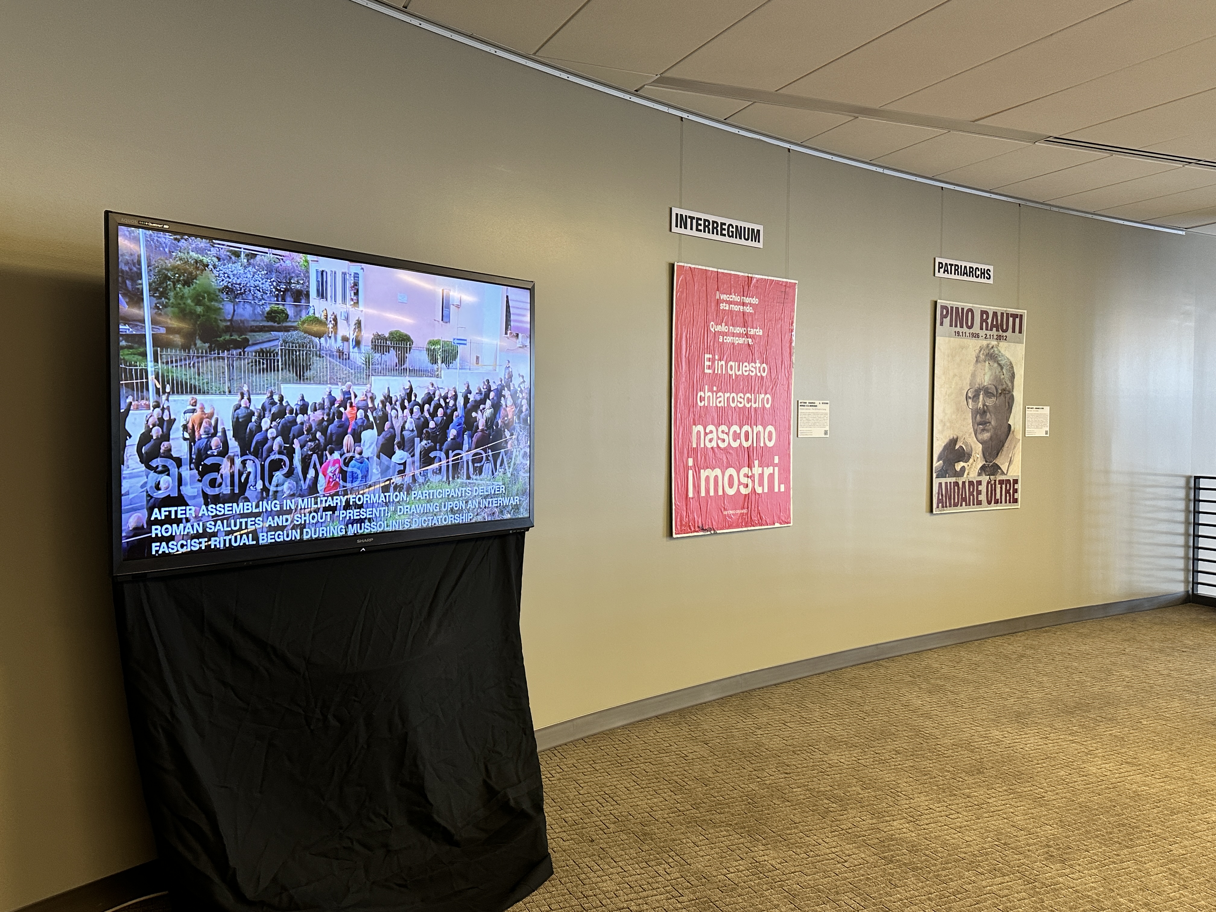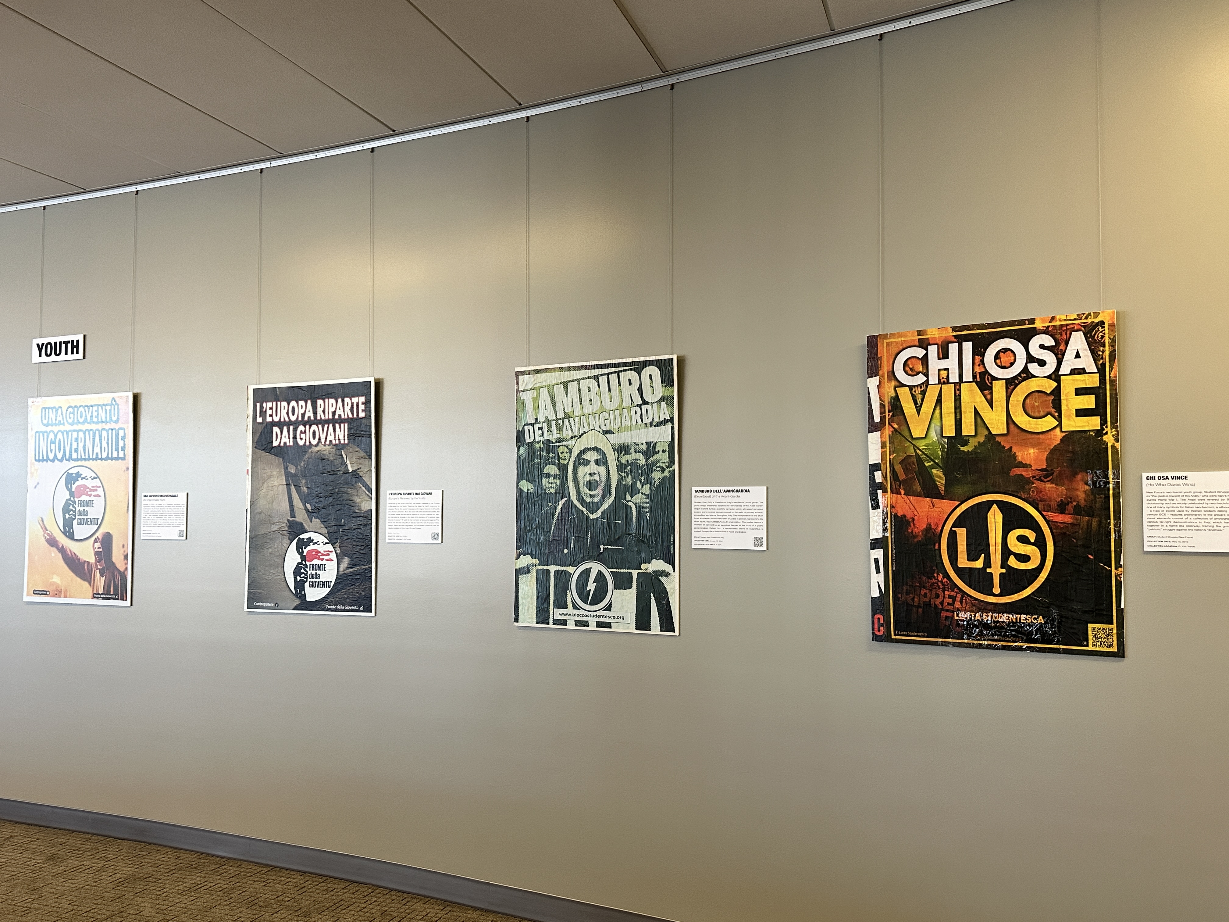 The exhibition features materials collected by Dr. Brian J. Griffith of the Department of History during his time in Rome on a Fulbright Fellowship in 2018. Visitors encounter posters, stickers, handbills, and banners, many of which were “harvested” directly from the streets of Rome by Griffith. Written content places each item in a broader context, describing the themes it uses to influence public sentiment toward authoritarianism and critically examining the imagery used. The exhibition also includes sound, movement, maps, and video to capture the experience of Rome during this time period.